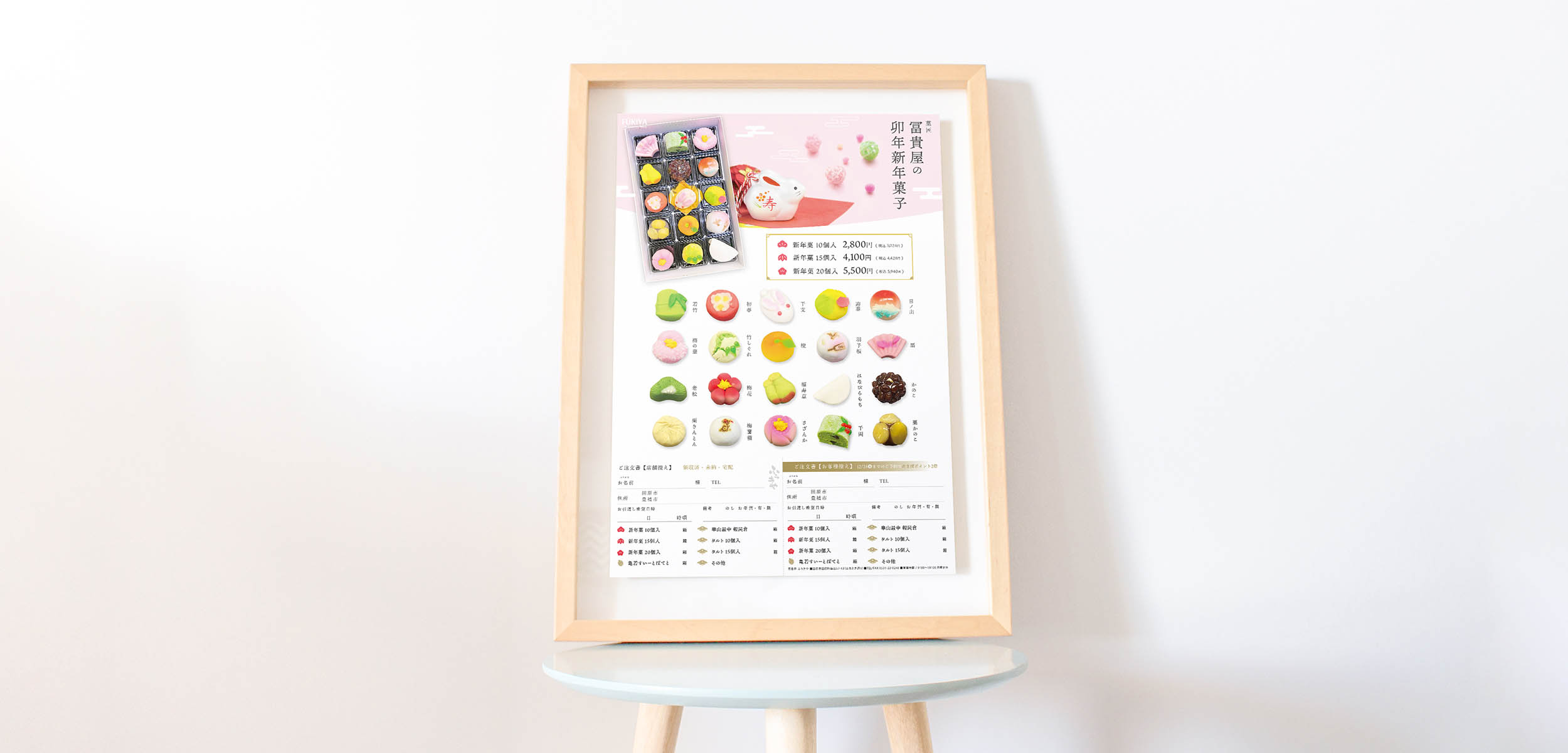 愛知県田原市の洋和菓子店「冨貴屋」様の卯年新年菓のご案内チラシを制作をいたしました。